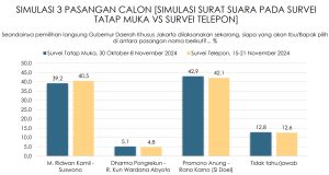 Jawabannya adalah, Ridwan Kamil-Suswono 39,2% (40,5%), Dharma-Kun 5,1% (4,8%), Pramono-Rano Si Doel 42,9% (42,1%). Yang menjawab tidak tahu/Tidak Jawab 12,8% (12,6%).